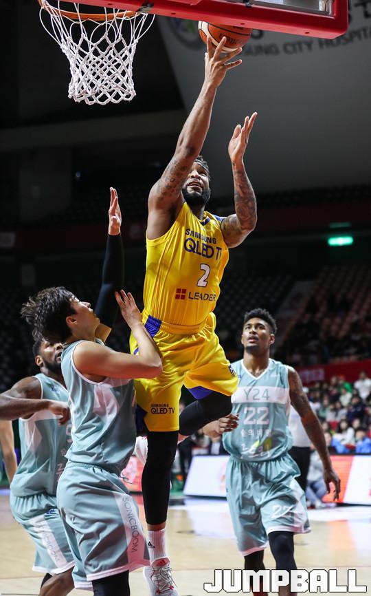 [점프볼=이원희 기자] 프로농구 서울 삼성이 원정에서 부산 KT를 이겼다. 원정 4연승 성공. 삼성은 28일 부산 사직체육관에서 열린 KT와의 경기에서 90-89로 승리했다. 삼성은 3연승을 내달리며 시즌 성적 18승21패를 기록했다. 6위 인천 전자랜드를 3경기차로 쫓았다. 리카르도 라틀리프가 24점 9리바운드, 마키스 커밍스도 3점슛 4개 포함 24점으로 활약했다. 이날 3점슛 9개를 터뜨릴 정도로 외곽 공격이 활발했다.
