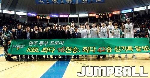 현재 시즌 13연승을 달리고 있는 DB의 행보는 2011-2012시즌 동부의 행보와 경기 결과 면에서 많이 닮아있다. DB가 올해 1월 1일부터 승리를 거두며 연승을 이어오고 있는 것처럼 6년 전 동부도 2012년 1월 1일 경기 승리를 시작으로 한 시즌 최다 16연승이라는 대기록을 작성했다. 그리고 그 16연승을 기록했던 곳이 전주실내체육관이었다. 팀 최다 42승이라는 또 하나의 값진 기록도 함께했던 순간이었다.