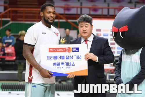 [점프볼=부산/서호민 기자] KT의 외국 선수 웬델 맥키네스(30, 192cm)가 트리플더블 달성 기념상을 수상했다.
