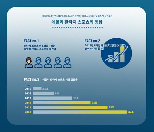 생긴지 10년도 안된 이 데일리 판타지 스포츠 게임은 이미 판타지 스포츠 팬의 5명 중 1명이 즐길 정도로 확산되어 있습니다. 2014년도에만 데일리 판타지를 즐기는 팬이 847% 증가했죠!