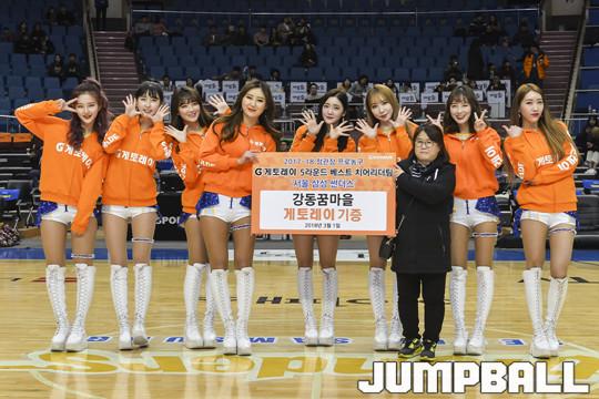5라운드 베스트 치어리더로 뽑힌 썬더걸스는 지난 1일, 서울지역 내 복지단체인 강동꿈마을을 인천 전자랜드와의 경기가 열렸던 잠실실내체육관으로 초대해 게토레이 30박스를 기증했다.