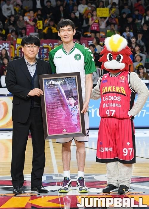 LG가 김주성을 위해 준비한 기념 액자에는 김주성이 2002년 당시 TG의 푸른 유니폼을 입고 있는 모습이 담겨있었다. 그리고 이 사진은 김주성의 정규리그 통산 출전 경기수를 의미하는 738개의 퍼즐조각으로 구성되어 그 의미를 더욱 뜻 깊게 했다. 또한 액자에는 ‘최고의 선수와 함께한 소중한 시간, 언제나 기억하겠습니다’라는 문구와 함께 LG 선수단 전원의 응원 메시지도 담겨있었다.