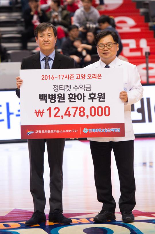 [점프볼=민준구 기자] 고양 오리온은 10일 고양체육관에서 열리는 2017-2018 프로농구 인천 전자랜드와의 홈경기에서 인제대학교 일산백병원에 지역 환아를 위한 후원금을 전달한다.