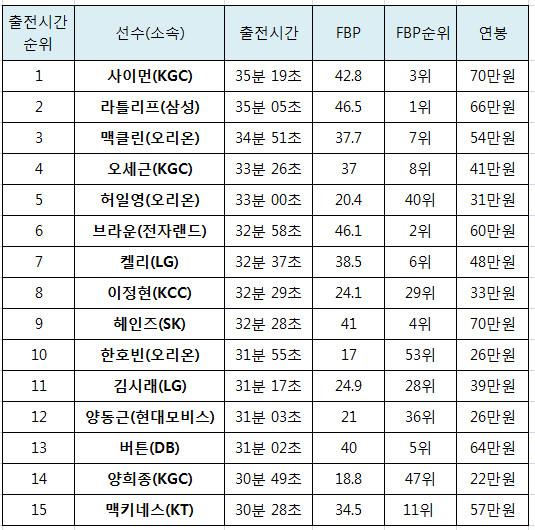 그러나 출전시간과 FBP가 꼭 비례하는 것은 아니다. 버논 맥클린(오리온)은 KBL에서 2번째로 많은 평균 출전시간을 기록했지만 FBP는 7위에 그쳤다. 자기 득점과 리바운드는 잘 해주지만, 팀이 워낙 약하다보니 그 외 기록을 살찌울(?) 기회가 적었다. 오리온의 국내선수들은 대체로 출전시간이 길었다. 이승현과 장재석 등이 군에 입대하고, 부상자도 많다보니 벤치가 얇아진 탓이다. 한호빈은 상무 제대가 무섭게 평균 30분 이상을 뛰는 주축 가드가 됐는데, 생산력은 많이 떨어지는 편이다. 출전시간은 많지만, FBP는 국내선수 중에서도 평범한 수준이다.