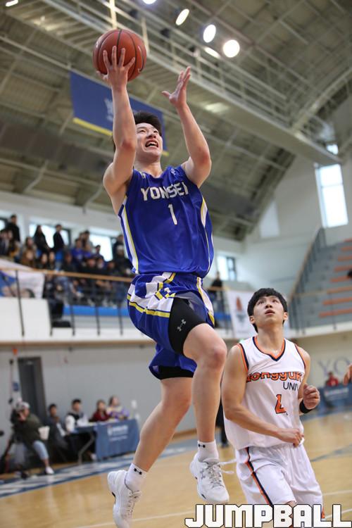 연세대는 빅맨인 한승희와 양재혁마저 3점포를 가동하며 상대 수비를 당황케 했다. 유기적인 패스 플레이를 활용한 공간 창출이 주효했다. 포지션과 상관없이 선수들도 자신감 있게 올라 3점슛을 성공했다. 동국대는 전반 종료 2분을 남기고 연세대가 펼친 새깅 디펜스에 실책을 범하는 등 좀처럼 힘을 쓰지 못했다. 52-29로 연세대가 앞서며 전반이 끝났다.