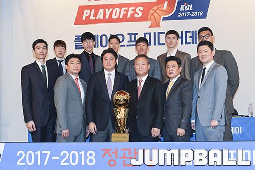 6강 플레이오프에 오른 정규리그 상위권 6개 팀이 한 곳에 모였다. 2017-2018 정관장 프로농구 플레이오프 미디어데이가 15일 리베라 호텔 베르사유홀에서 열렸다.