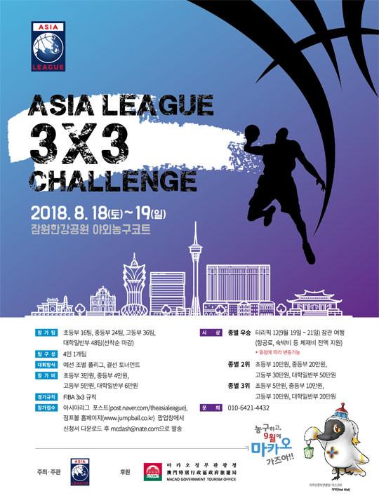 오는 8월18일(토)부터 19일(일)까지 잠원한강공원 야외 농구코트에서 개최 예정인 아시아리그 3x3 챌린지는 초등부, 중등부, 고등부, 대학일반부 4개 종별에 참가가 가능한 대회다.