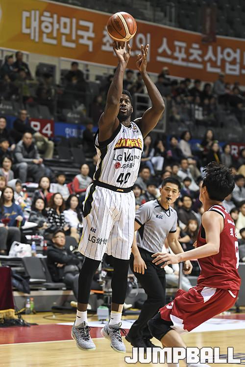 지난 SK전에서는 외곽에서 3점슛 10개를 시도해서 4개를 성공하며 준수한 슛감각을 선보였다. 반면에 골밑에서는 적극적인 몸싸움을 기피하는 듯한 모습을 보이기도 했다. 하지만 이날은 달랐다. 골밑 플레이에 비중을 두었고, 팀이 외곽에서 원활하지 않자 본인이 밖으로 나와서 직접 3점슛을 시도하는 등 내외곽에서 만점활약을 펼쳤다.