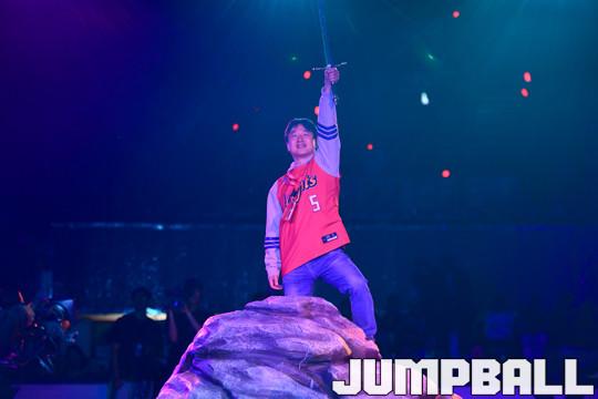 경기 시작을 위한 국기에 대한 경례가 끝난 후 경기장이 암전되면 코트 정중앙에 칼이 꽂혀있는 모형 바위산이 등장한다. 그리고는 한 팬이 저벅저벅 걸어와 바위산 위의 칼을 하늘을 향해 뽑는다. 그 다음 잠실학생체육관의 천장에서 오프닝 영상이 상영된 후 SK의 베스트 5가 소개된다.